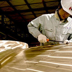 Craftsman skills are essential for built-to-order production and are irreplaceable, even by advanced machine processing technology. The craftsman skills of experienced workers are applied to the casting of the delicate curved surface of propellers.
